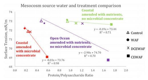 圖 1. SFT 與蛋白質多糖比的比較 (蛋白質:多糖)在開闊的海洋與兩個沿海環境中。 這 蛋白質:多糖的所有環境的處理都顯示出類似的趨勢 其中 CEWAF > DCEWAF > WAF ≥ Control 并且 SFT 的趨勢是 與此模式相反。 每個數據點是一式三份的平均值(3 個獨立的 每次治療的中胚層和 5 次 SFT 測量值 < 0.30 mN/m CEWAF 的標準偏差,其他處理的標準偏差 < 0.05 mN/m)。
