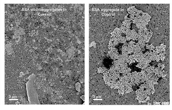 相同放大倍數下 BSA 聚集體的 SEM 圖像(圖 3b) 在 Corexit(左)和 ASW 中用 0.1% BSA 溶液制備 來自與圖 3a 中相同的溶液的對照處理(右)。 這 Corexit 處理(左圖 3b)顯示來自液體的微聚集體 階段。 對照處理(圖 3b 右)顯示了一個大結晶 蛋白質聚集體。 圖 3a 和 3b 中描繪的結果支持 靜電相互作用和共價鍵作用的重要性 在微聚集體形成中(Corexit 與 Ca2+ 離子突出顯示 CTC) 和 Ca2+ 螯合中的配位共價鍵 CTC 和陰離子親水部分(CEWAF、WAF 和對照 處理)形成比 Corexit 更少但更大的聚集體 治療。