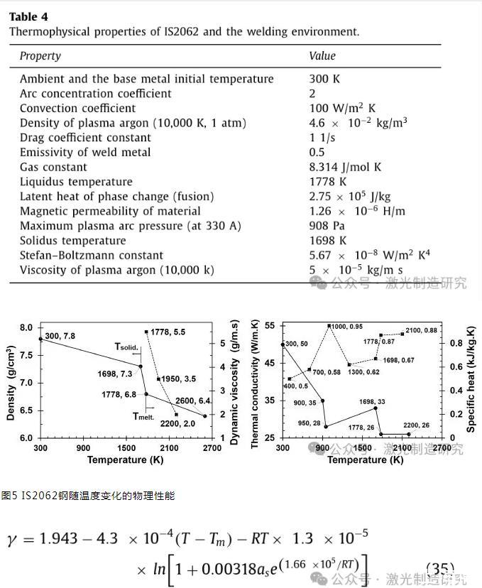 表4顯示了在該模擬中應用的IS2062鋼的熱物理性質。在溫度相關條件下考慮了相變和合金元素對不同物理性質的影響(圖5)。這些特性是從不同的數據庫中收集的,包括FLOW-3D的流體數據庫和其他關于低碳鋼的文獻。自由表面的表面張力被定義為假二元Fe–S系統中溫度和硫含量的函數: