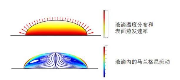 -液滴蒸發過程:液滴在蒸發過程中,邊緣處的溶質濃度增加或溫度下降可能導致表面張力增大,形成向中心的馬蘭格尼流,影響蒸發速率和液滴形態演化。