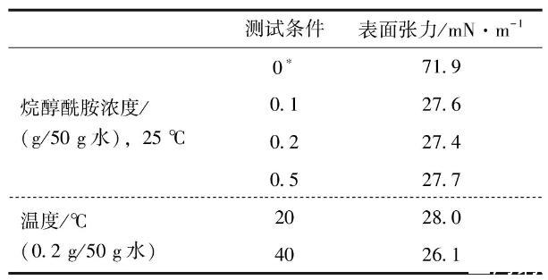 某學生自制烷醇酰胺不同測試下表面張力測試值,如表1所示。合成的烷醇酰胺具有較強的表面活性。25℃下純水表面張力為71.9℃mN/m。當50 g水中加入0.1 g烷醇酰胺時,其表面張力顯著降低,為27.6 mN/m。當增至0.2 g時達到最低值(27.4 mN/m),繼續(xù)增加,反而略有增加。上述結果表明,0.2 g烷醇酰胺加入量已達到其CMC濃度。同樣,在最佳濃度下(0.2 g/50 g水),隨著測試溫度的升高,烷醇酰胺水溶液表面張力降低。