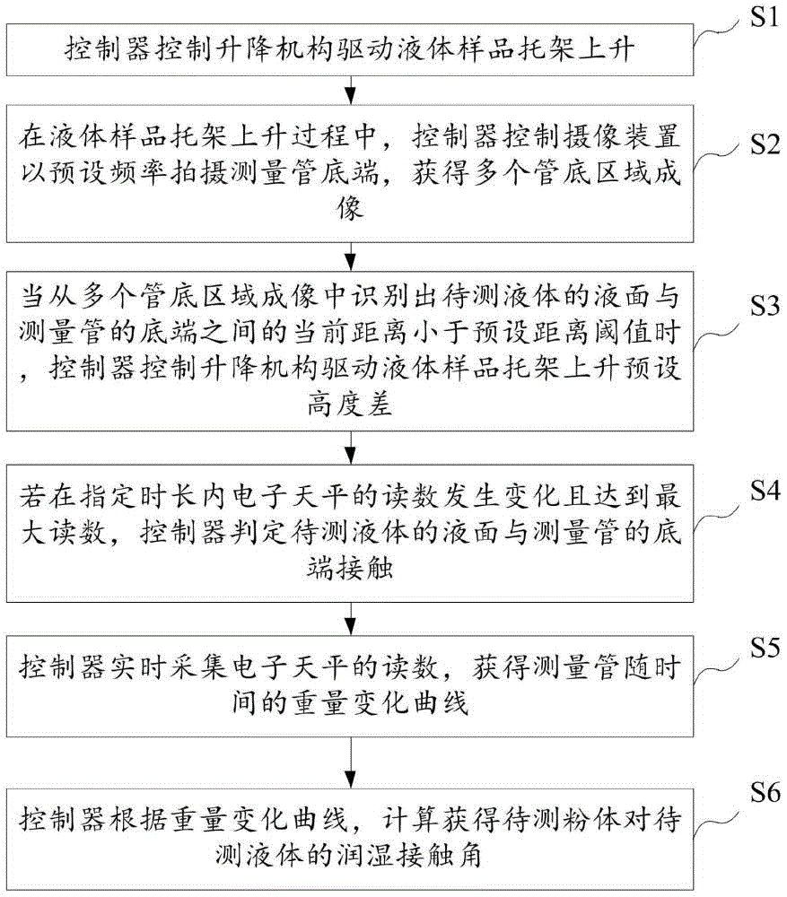 為此,現(xiàn)有技術(shù)中提出一些理論,即可選擇潤濕過程中在各個(gè)時(shí)間段測量粉體床內(nèi)液體質(zhì)量,從而得出質(zhì)量對時(shí)間的變化,求取液體對固態(tài)粉體的接觸角。但是,每次稱重測量時(shí),需要將樣品測量管提出液面并擦去連帶的水分,操作比較繁瑣,且無法精確控制每次擦除的液體量,造成了稱重測量過程中的不連貫性,也會(huì)使得結(jié)果誤差放大。
