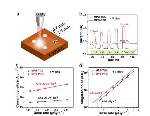 圖4.MAPbBr3單晶探測器的x射線探測器。(a)結構圖;(b)光電流響應;(c)靈敏度;(d)探測極限。