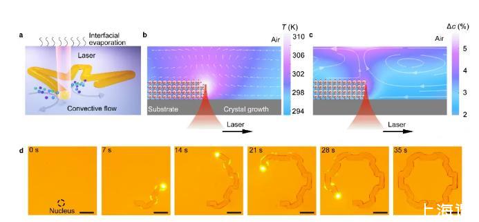 研究者利用COMSOL模擬了激光照射下鈣鈦礦晶體周圍的局域過飽和度,并通過實驗驗證了過飽和度產生的原理。其中馬倫格尼對流的引入加速了傳質過程,使得鈣鈦礦結構能夠在激光誘導下快速生長,在實驗中,MAPbBr3鈣鈦礦單晶的生長速度可達0.1 mm/s,顯著快于傳統的鈣鈦礦單晶制備方法。激光閾值功率約為150μW,低于現有的激光調控鈣鈦礦結晶過程方法。