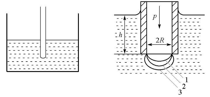 由于最大氣泡壓力法的器材易得,且易于學生理解表面張力的原理,因而一直是教學中測定液體表面張力的一種常用方法[2]。如圖1所示,測定時將一根毛細管插入待測液體內部,從管中緩慢地通入惰性氣體對其內的液體施以壓力,使管端形成氣泡逸出。當所用的毛細管管徑較小時,可以假定所產生的氣泡是球面的一部分;但是在氣泡生成及發展過程中,氣泡的曲率半徑會隨惰性氣體的壓力變化而改變。當氣泡的形狀恰為半球形時,氣泡的曲率半徑最小(即毛細管半徑R),此時根據Laplace方程,管內外壓差達最大,其值Δpmax=p-ρgh可由差壓計測量得到[3]。利用最大壓差和毛細管半徑即可計算表面張力σ: