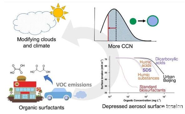 研究進(jìn)一步表明,忽略表面張力降低效應(yīng)將導(dǎo)致在云中典型過飽和度范圍內(nèi)(0.23%-0.76%)超細(xì)云凝結(jié)核(直徑<100 nm)的數(shù)濃度降低6.8%-42.1%。綜上所述,本研究提供了有機(jī)物降低城市氣溶膠表面張力的新證據(jù),表面張力的降低將增加云凝結(jié)核的數(shù)量,從而影響云和氣候(圖3)。
