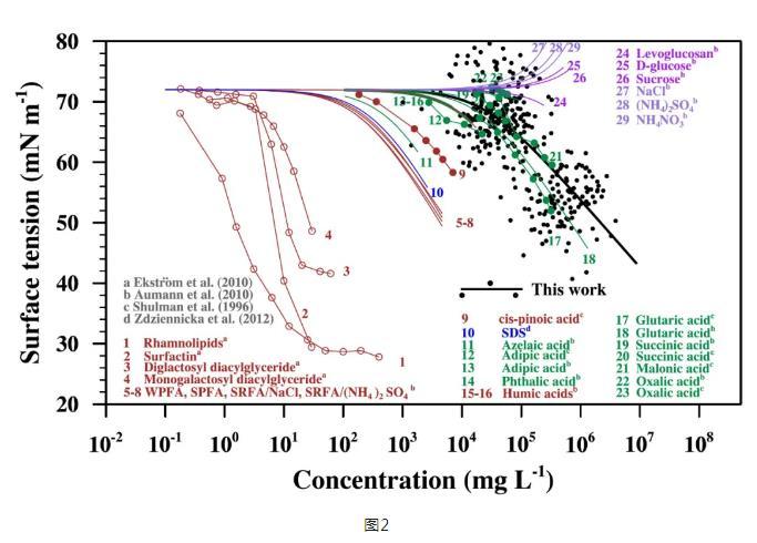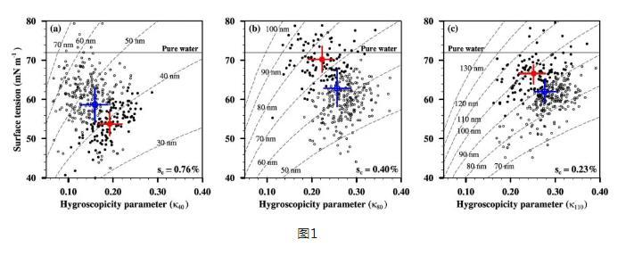 大氣氣溶膠作為云凝結(jié)核,通過與云的相互作用對氣候產(chǎn)生影響。氣溶膠活化為云滴,除了取決于氣溶膠的粒徑大小、化學(xué)成分和混合狀態(tài),更進(jìn)一步地,與氣溶膠的表面張力息息相關(guān)。大氣氣溶膠和云滴中廣泛存在著具有表面活性的有機(jī)物,它們可以減小氣溶膠活化時的表面張力,降低粒子增長的能量壁壘,使氣溶膠更容易被活化為云滴,從而增加云滴數(shù)濃度。本次研究結(jié)果表明:有機(jī)物顯著降低了污染大氣中氣溶膠的表面張力。