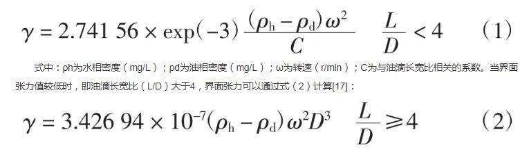式中:ρh為水相密度(mg/L);ρd為油相密度(mg/L);ω為轉(zhuǎn)速(r/min);C為與油滴長寬比相關(guān)的系數(shù)。當(dāng)界面張力值較低時(shí),即油滴長寬比(L/D)大于4,界面張力可以通過式(2)計(jì)算: