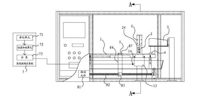 [0018]在一些實施方式中,還包括清洗液供應系統,清洗液供應系統包括凈化單元、恒溫加熱單元和泵體。清洗液通過凈化單元凈化并通過恒溫加熱單元進行加熱后,再經由泵體供應到清洗槽當中。其有益效果是,先通過凈化單元,可以預先清除掉清洗液當中可能存在的油。另外,通過恒溫加熱單元可以將清洗液加熱到一定的溫度。因為溫熱狀態的清洗液,可以實現更加的油脂清除能力,從而可以將樣品上的油更方便且更完全的清洗下來。