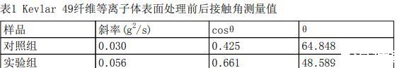 測量結(jié)果如下表所示,測量結(jié)果為三次平行樣的平均值。可見經(jīng)等離子體表面處理后,芳綸纖維與水的表面接觸角降低16°,潤濕性提高。