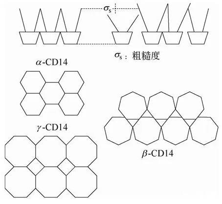 為了考察環(huán)糊精種類對所制備LB膜結構的影響,Schalchli等用X-Ray反射技術對3種兩親性環(huán)糊精(α-、β-、γ-)在硅片上形成的LB單分子膜結構進行了研究。結果顯示,所有兩親性環(huán)糊精都在基底上形成了單分子層,但兩親性α-和γ-環(huán)糊精LB膜的結構相似,而β-環(huán)糊精LB膜的結構與前兩者有很大的不同。并且兩親性β-環(huán)糊精LB膜的粗糙度也遠遠大于兩親性α-和γ-環(huán)糊精。以上不同的原因緣于β-環(huán)糊精的七邊形環(huán)不同于α-,γ-環(huán)糊精的六或八邊形環(huán)是對稱結構,從而不能像α-,γ-環(huán)糊精那樣在基底上形成有序的結構,如圖1所示。類似地,Alexandre等用掃描力顯微鏡(scanning force microscopy)考察了兩親性α-,β-,γ-全疊氮基環(huán)糊精在云母片上的LB膜的結構。無論在納米尺度還是在微米尺度下觀察,β-全疊氮基環(huán)糊精勻呈現(xiàn)出不同的形貌。