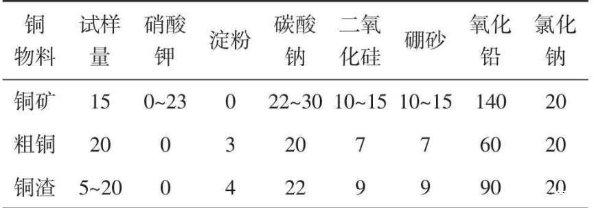 配料前可根據(jù)待測物組分確定熔渣的硅酸度,然后計算各熔劑的需要量。同時根據(jù)試樣還原力試驗結(jié)果(或理論計算試樣的還原力)調(diào)整氧化劑或還原劑加入量。通過優(yōu)選實(shí)驗,推薦含銅物料的配料可按表1進(jìn)行。