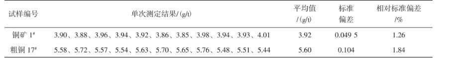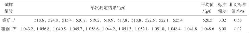 稱取20.00 g樣品,銅礦、銅渣樣直接干法試金配料,按試驗方法進(jìn)行分析,結(jié)果見表4和表5。
