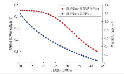 圖4凝析油臨界流動飽和度和界面張力隨壓力的變化