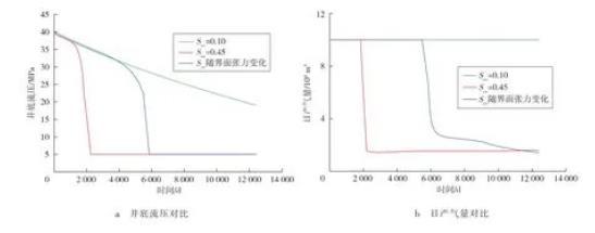 圖4為凝析油臨界流動飽和度和界面張力隨地層壓力的變化圖。圖中顯示,隨開發過程中地層壓力下降,界面張力增大,凝析油臨界流動飽和度逐漸上升,反映了凝析油在近井地層聚集堵塞孔喉難以流動的特征。常規數值模擬方法凝析油臨界流動飽和度Scc=0.10和Scc=0.45,均為常數,不能清晰地表征凝析油流動特征隨著界面張力增大的變化。