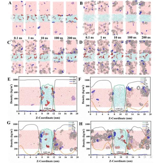 界面層厚度受分子種類、結構及密度影響顯著。實驗表明,實驗組尤其是實驗2中油相增厚,可能是由于TAN在油水界面與膽鹽和β-CD發生相互作用。該現象說明β-CD與TAN之間的相互作用不僅促進了TAN向界面遷移,還揭示了BS或β-CD對TAN的吸附能力。實驗組界面β-CD密度提升,說明β-CD與TAN相互吸引。動力學模擬結果表明β-CD先與TAN結合于界面,誘導膽鹽圍繞此復合物聚集,系統能量漸趨穩定。最終,TAN主要錨定于由膽鹽與環糊精構筑的界面團聚體上,增強環糊精對膽鹽的親和力,導致環糊精與膽鹽組裝形成更大的聚集體,從而增加界面厚度。