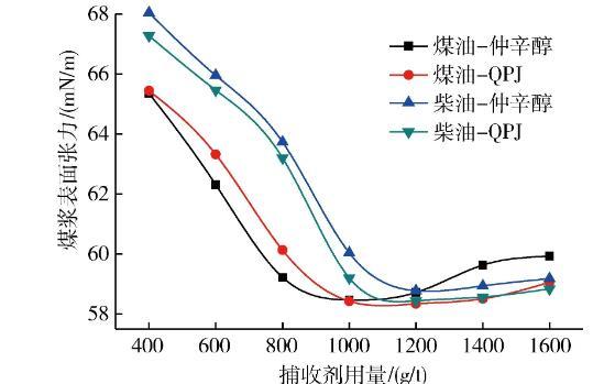 使用QPJ做起泡劑時(shí),煤漿表面張力在煤油用量為1000 g/t時(shí)達(dá)到最低值,在煤油用量超過(guò)1400 g/t后開始明顯回升;煤漿表面張力在柴油用量達(dá)到1200 g/t時(shí)達(dá)到最低值,在超過(guò)1400 g/t后開始回升。由此可見,捕收劑對(duì)煤漿的表面張力有著較為顯著的影響。