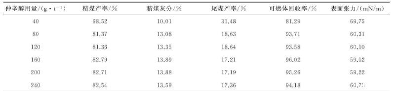 在浮選過(guò)程中,煤油作為捕收劑能與煤顆粒作用,影響煤顆粒的潤(rùn)濕或疏水性;仲辛醇作為起泡劑,能夠在氣—液界面吸附濃集,降低氣—液界面的表面能,生成直徑較小的氣泡,起到起泡作用;煤油和仲辛醇共同使用時(shí),兩種藥劑在氣—液界面有聯(lián)合作用,產(chǎn)生共吸附現(xiàn)象[4]。