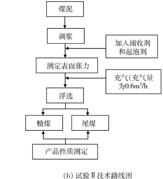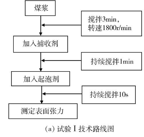試驗(yàn)分為試驗(yàn)Ⅰ和試驗(yàn)Ⅱ兩部分。在試驗(yàn)Ⅰ中,先后改變捕收劑和起泡劑用量,對(duì)添加浮選藥劑后煤漿的表面張力進(jìn)行測(cè)定,以研究浮選藥劑用量對(duì)煤漿表面張力影響的規(guī)律。在試驗(yàn)Ⅱ中選用煤油/仲辛醇做捕收劑/起泡劑,先后改變煤油和仲辛醇的用量,按照《GB/T 4757-2013煤粉(泥)實(shí)驗(yàn)室單元浮選試驗(yàn)方法》對(duì)馬蘭2#煤泥進(jìn)行浮選試驗(yàn),并在浮選充氣前對(duì)煤漿同步進(jìn)行表面張力的測(cè)定,進(jìn)一步對(duì)浮選過(guò)程中浮選藥劑量、煤漿表面張力及浮選效果之間的關(guān)系進(jìn)行探索。試驗(yàn)控制煤漿濃度為100 g/L,溫度為22±0.2℃;使用一次去離子水(pH值為7.0±0.2)。試驗(yàn)技術(shù)路線見圖1。