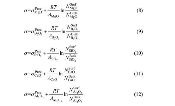 對于MgO-B2O3-SiO2-CaO-Al2O3體系,依據Bulter方程,其表面張力可以分別表示為