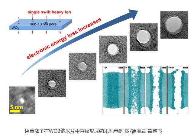 科研人員基于蘭州重離子研究裝置(HIRFL),利用快重離子作用于WO3納米片材料,實現了直接“打孔”的制備方法。同時,科研人員利用分子動力學模擬對物理機理進行解釋,發現重離子在材料中的沉積能量會引起材料局域瞬時熔融噴發,以及熔融相的粘度和表面張力大小是決定納米孔形成的關鍵因素。