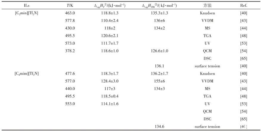 表1用不同實(shí)驗(yàn)方法測(cè)定的離子液體[Cnmim][Tf2N](n=2,4)的汽化焓