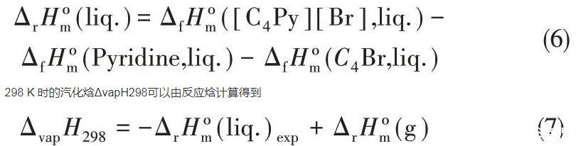 這些數(shù)據(jù)與Kabo等[40]使用Knudsen滲出法獲得的數(shù)據(jù)非常一致,但低于Santos等[43]使用微量熱法測(cè)量的蒸發(fā)熱。總而言之,他們認(rèn)為離子液體以離子對(duì)的形式蒸發(fā),而汽化熱主要取決于液相和氣相離子對(duì)之間的庫(kù)侖相互作用。