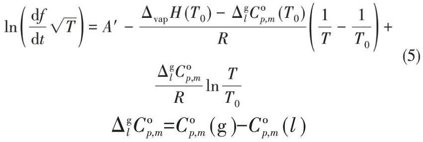 Verevkin等[54]開(kāi)發(fā)了評(píng)估程序的物理基礎(chǔ),并使用1-乙基-3-甲基咪唑雙(三氟甲磺酰基)酰亞胺[C2mim][Tf2N]進(jìn)行測(cè)量,從而將蒸發(fā)焓的測(cè)量范圍降低到363 K。和文獻(xiàn)中已有的數(shù)據(jù)相比較,具有一致性。這項(xiàng)工作中開(kāi)發(fā)的方法也為得到ILs的汽化焓開(kāi)辟了一條新途徑。經(jīng)過(guò)一系列公式推導(dǎo),構(gòu)建了ILs的摩爾汽化焓、頻率損耗率df/dt和溫度的關(guān)系