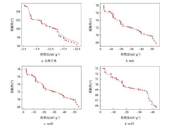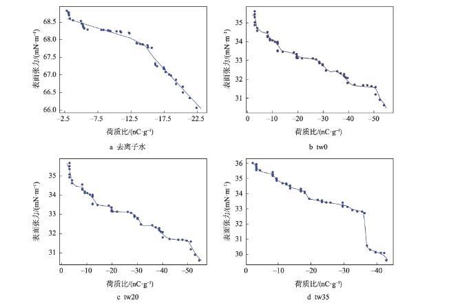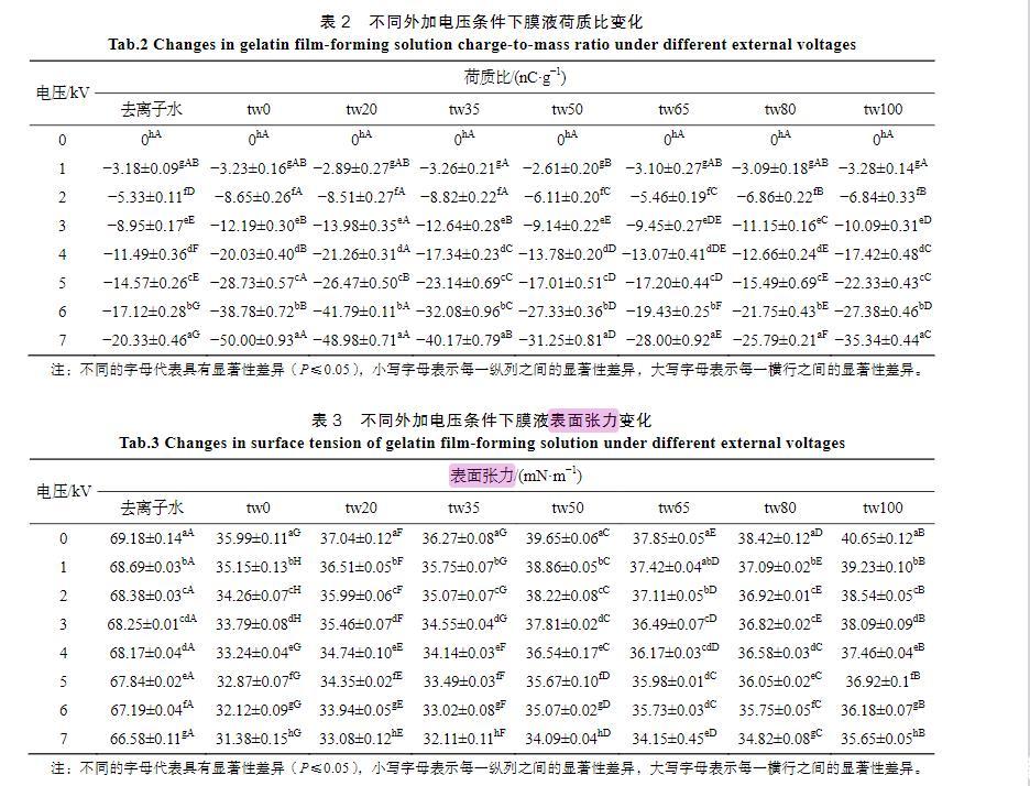 隨著膜液中吐溫20的減少和司盤20的增多,明膠液滴荷質比亦呈增高趨勢(<0.05)。張建桃等[13]研究表明,介質的電導率改變會引起其荷電性能的改變。相同質量濃度下司盤20的物質的量濃度更高,導致溶液電導率及液滴荷質比增加更為明顯。然而,與只添加吐溫20的明膠溶液(tw100)相比,少量司盤20的添加(tw80)還會引起荷質比的顯著減少(<0.05),推測這是由于溶液中吐溫20與司盤20分子通過“經典疏水作用”在水溶液中優先結合,從而使溶液中總溶質相對濃度下降導致[14]。