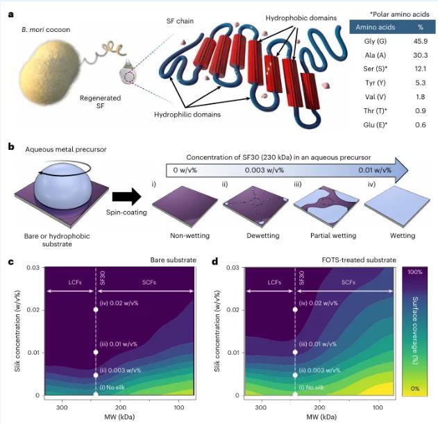 圖1作為天然表面活性劑的SF。b,旋轉涂層金屬水合物提高表面覆蓋率的示意圖。金屬水合物溶液的表面覆蓋率的示意圖。c,d,添加了SF的金屬水溶液的表面覆蓋率(%)。的表面覆蓋率(%)。基底(c)和基底上的表面覆蓋率(%)。基底(d)上SF添加的金屬水溶液的表面覆蓋率(%)與濃度和分子量的函數關系。