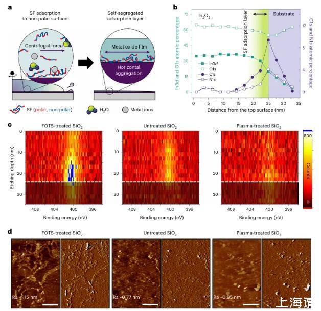 圖3絲綢表面活性劑在薄膜-固體界面的自適應吸附。a,表面活性劑在涂覆過程中的自分離示意圖。b,XPS深度剖面化學成分分析厚度為25納米的In2 O3薄膜的化學成分分析。數據c,N1s在In2O3薄膜中的N1s分布。SF沉積在具有不同自由表面能的基底上的In2 O3薄膜中的N1s分布。白色虛線線表示與二氧化硅d,通過選擇性蝕刻金屬氧化物獲得的埋藏SF層的高度和偏轉AFM圖,通過選擇性蝕刻金屬氧化物獲得(比例尺,1μm;Ra,平均值;Ra,算術平均粗糙度)。