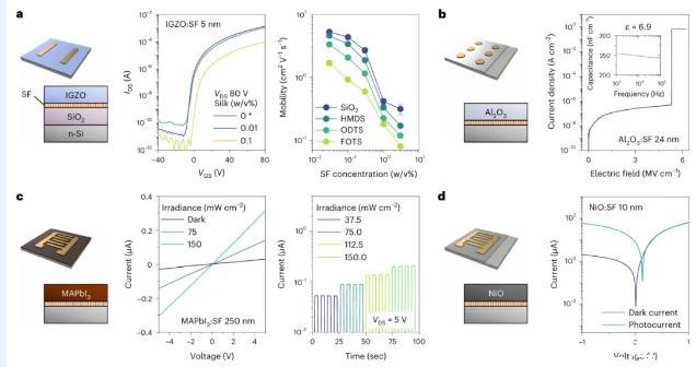 圖4使用絲表面活性劑的水激活納米器件。基于IGZO:SF的場效應晶體管(FET)。中間:用不同的晶體管的轉移曲線。右圖:不同SF晶體管的電荷遷移率。數據點和誤差條顯示平均值±s.d.(樣本數為3)。以及制備的MAPbI3的薄膜的I-V特性。d,基于NiO:SF的光電探測器的結構(左)和在不同側向電壓(中)和時間(右)下的光探測器的結構(左)及其在白光照明下的I-V特性(右)。(右圖)。所有器件都是在疏水性基底上制造的SF基絕緣體的結構(左)及其電流密度-電場曲線。