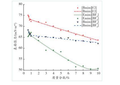 圖2表面張力與離子液體質量分數之間的關系