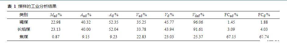 選取不同變質程度的褐煤、焦煤及長焰煤,將煤樣放入球磨機中粉碎,并通過篩網過濾出粒徑在0.074 mm(200目)以上的煤粉,置于45℃真空干燥箱中干燥24 h后放入密封袋中低溫、避光保存。利用全自動工業分析測定儀對3種煤樣的水分、灰分和揮發分進行測定,計算固定碳,其工業分析結果如表1所示。