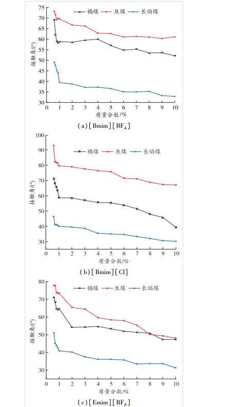 對于光滑的煤樣,離子液體對煤樣的潤濕程度采用接觸角作為評價指標。3種煤樣的接觸角與不同離子液體質量分數之間的關系如圖3所示。