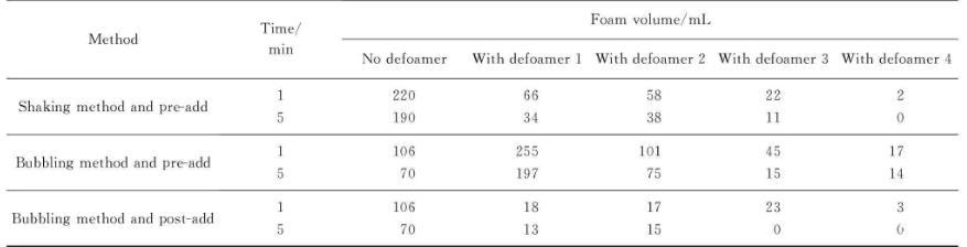 用鼓氣法研究了不同的消泡劑添加方式,由表1可以發(fā)現(xiàn)后添加方式比先添加方式的初始泡沫明顯降低。后添加方式的消泡劑大量聚集于泡沫表面,破壞了氣液界面的平衡。雖然在實際生產過程中以先添加方式為主,但試驗結果給出了制備工藝改進的思路。