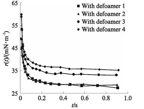 圖1是添加消泡劑后起泡液(0.2%二異辛基琥珀磺酸鈉鹽水溶液)的動態(tài)表面張力r(t)與時間t的關系圖。由圖1可以看出:在同樣的添加量下,分子級消泡劑(消泡劑1、2)可使起泡液具有更低的動態(tài)表面張力,這與其雙子結構有關;有機消泡劑(消泡劑3、4)在起泡物質的協(xié)同作用下,也具有一定的降低起泡液動態(tài)表面張力的能力;在起泡液中,不論是加入分子級消泡劑還是有機消泡劑,在時間趨于1s時,其表面張力都低于36mN/m.