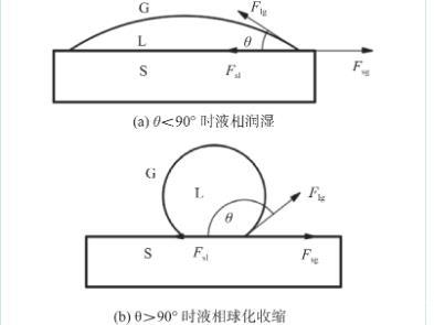潤濕角θ的大小直接反映了液相對固體表面的潤濕程度,θ越小,潤濕性就越好。當(dāng)θ為0°時,表示完全潤濕,小于時為潤濕狀態(tài),而大于時為不潤濕狀態(tài)。由于相同體積下,球形的表面積最小,表面張力驅(qū)使液體聚集到最小表面積狀態(tài),在釬料熔化后便聚合在一起收縮成球狀,從而發(fā)生液態(tài)釬料聚合現(xiàn)象。