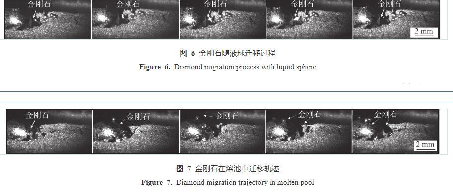 圖6所示為金剛石在液態(tài)球上的運動軌跡。隨著激光熱作用,釬料首先熔化成小液滴,然后匯聚成小球,由圖6可以看出,金剛石在液態(tài)小球上不穩(wěn)定的運動,以致可以見到金剛石表面亮度很高的閃光,這是金剛石反射的激光。圖7是激光釬涂過程中,金剛石在釬涂熔池中的運動路徑。金剛石顆粒首先存在于熔池邊緣底部,隨著釬涂過程的進行,金剛石顆粒沿熔體球面逐漸向上部運動,然后在熔池表面向后方移動,當(dāng)激光熱源遠離,熔池開始凝固,金剛石顆粒被固結(jié)于涂層近表面位置,保持一定的出刃高度,有利于發(fā)揮耐磨作用。金剛石運動總趨勢是沿液態(tài)球表面或熔池邊緣向液/氣界面遷移。