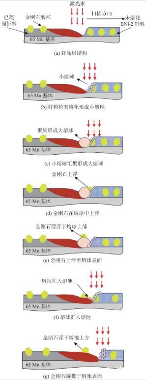 (2)金剛石釬涂層的成形歷經(jīng)粉末釬料熔化、液態(tài)釬料聚合、釬料微粉吸附熔合、釬料潤濕鋪展、金剛石遷移至涂層表層、涂層凝固成形6個階段,金剛石釬涂過程中,金剛石趨向于沿著熔體表面邊緣上浮,這主要是由于金剛石與液態(tài)釬料之間的界面張力遠大于與固態(tài)基體界面張力所致。