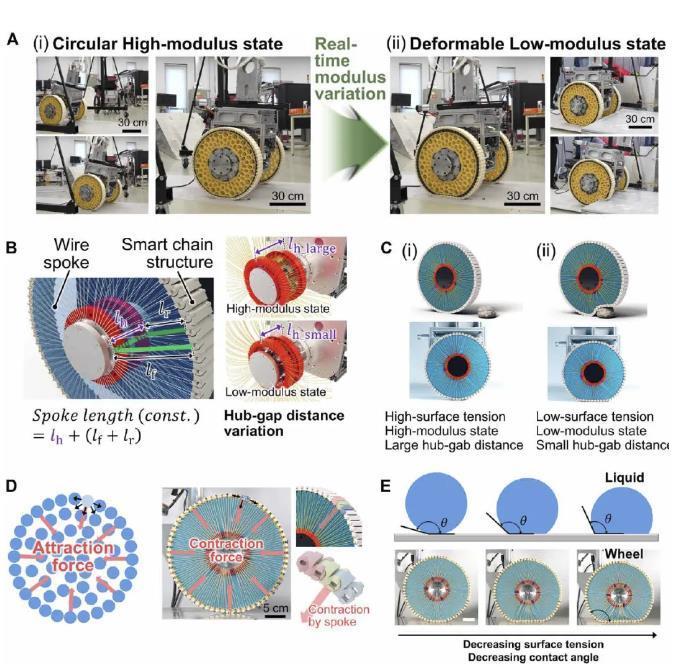 這是一個受液滴表面張力啟發的可變剛度輪。在液滴中,隨著最外層液體分子的內聚力的增加,將液體分子向內拉的凈力也增加。這導致高表面張力,導致液滴從引力引起的扭曲形狀恢復為圓形。同樣,車輪的形狀和剛度是通過改變最外層智能鏈塊的牽引力來控制的。隨著連接到每個鏈塊的鋼絲輻條張力的增加,車輪特性反映了一般圓剛輪的特性,這在正常平坦地面上的高速運動中具有優勢。相反,隨著線輻條張力的減小,車輪的模量減小,并且根據障礙物的形狀,車輪容易變形。這使得輪子適合克服障礙物,而不需要復雜的控制或傳感系統。在此機理的基礎上,將輪子應用于重達120 kg的兩輪輪椅系統,實時實現了輪椅在室外環境中駕駛時,圓形高模量狀態和可變形低模量狀態的狀態轉換。