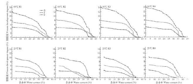 圖3給出了三種試樣四次脫濕循環在不同溫度條件下裂隙度隨脫濕含水率的變化。同一土樣,相同含水率情況下,裂隙度隨著干濕循環次數的增加而增大,而相同裂隙度對應的含水率也隨循環次數