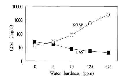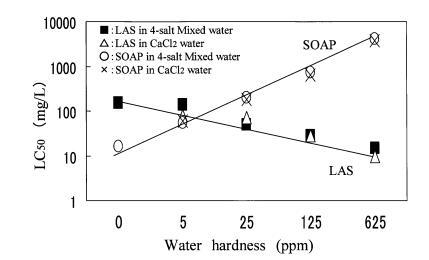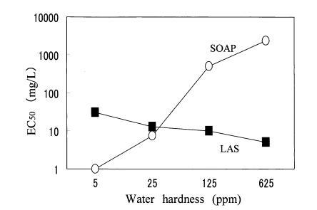 在預測試中,大型水蚤在 4 鹽混合中存活 溶液,但不能在 CaCl2?H2O 溶液中存活,也不能 蒸餾水。 另一方面,羅漢松在所有 3 種水中都能存活。 因此,羅漢果被用來 檢查水硬度成分對 LAS 和 SOAP 的毒性。 如圖 3 所示,CaCl2?H2O 之間沒有觀察到毒性值的差異 溶液和四鹽混合溶液。 肥皂的毒性 隨著水硬度的增加而降低,和 LAS的毒性隨著水硬度的增加而增加。