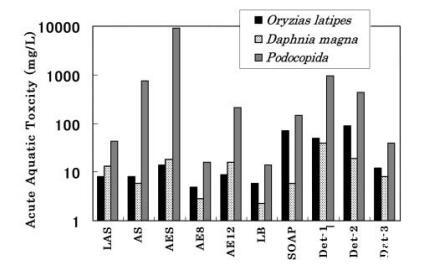 7 種表面活性劑和 3 種商品化劑的急性毒性 使用 3 種測試生物測量清潔劑: oryzias latipes、daphnia magna 和 podocipida。 結果 如圖 1 所示。在所有情況下,EC50 和/或 LC50 podocopida 高于 oryzias latipes 和 daphnia magna。 SOAP 和 LB 的毒性值 oryzias latipes 高于 daphnia magna, 而其他 5 種表面活性劑的毒性值 oryzias latipes 或 daphnia magna 幾乎相等。 這 表面活性劑可分為三類; 低毒 組(AES、SOAP 和 AE12),中毒性組(LAS 和 AS) 和高毒組 (AE8 和 LB)。