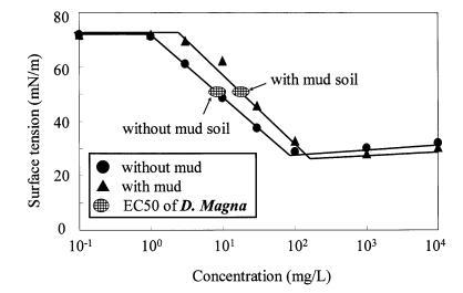 圖 12 泥土存在對地表的影響 AE和有毒表面張力的張力曲線 Daphnia Magna 的價值。