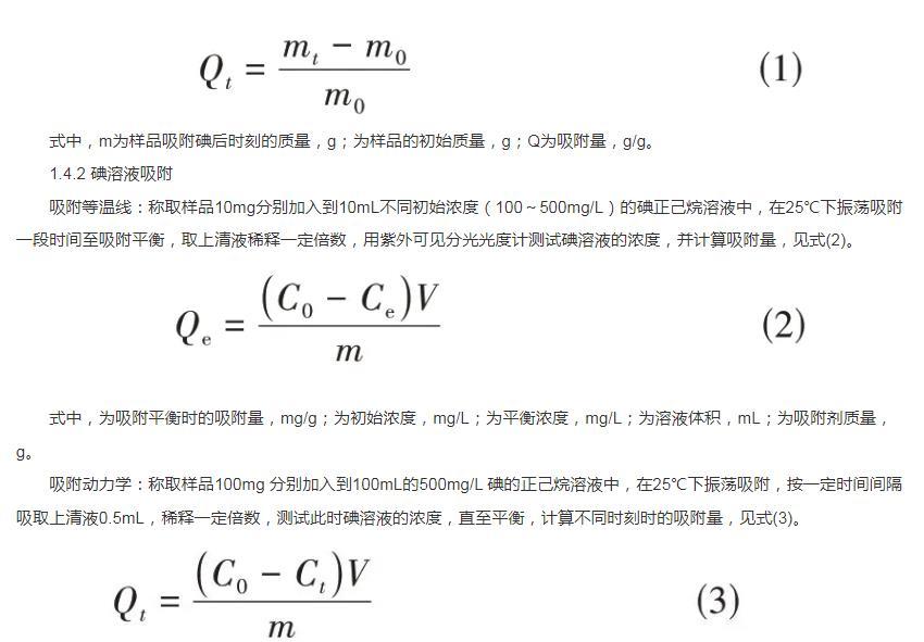 式中,m為樣品吸附碘后時刻的質量,g;為樣品的初始質量,g;Q為吸附量,g/g。