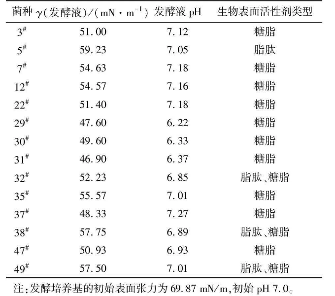 經(jīng)富集分離共得到49株細(xì)菌,初步篩選出14株生長(zhǎng)較好的目的菌株接種于發(fā)酵培養(yǎng)基。在微生物采油過程中,表面活性劑和有機(jī)酸可以把原油從巖層中剝離下來,提高原油流動(dòng)性。因此,以發(fā)酵過程中發(fā)酵液的pH和表面張力的降低為指標(biāo),對(duì)初篩得到的菌株進(jìn)行復(fù)篩,同時(shí)分析所產(chǎn)生物表面活性劑的類型,結(jié)果見表1。