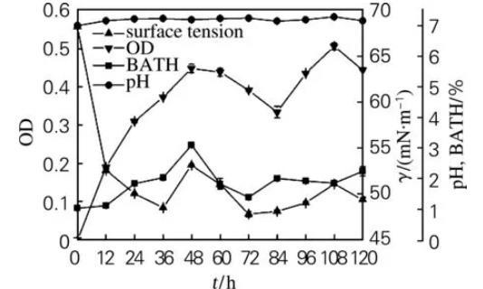 生物表面活性劑產(chǎn)生菌菌體密度、細(xì)胞疏水性與發(fā)酵液pH及表面張力的關(guān)系(二)