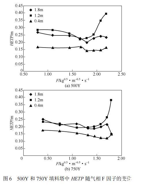 圖6為500Y和750Y填料塔中不同高度填料段HETP隨氣相F因子的變化。高度以填料層底部為基準。如圖6所示,填料段下部傳質效率較高,上部傳質效率下降。這是由于流體分布不均造成的。液相從頂端向下流動時,由于端效應,經過一定高度填料層后液相才能鋪展開,接近均勻分布。而氣相因為受液相流動的影響,在填料塔下端氣相入口段分布比較均勻,在填料段頂端分布不均。從圖6還可以看出填料段中上部的傳質效率波動較大,這是由于在此段填料內流動狀況較為復雜,持液量和傳質面積波動較大。Basden等指出持液量隨塔高并不是恒定的,在一定的氣液相流量下,Mellapak 500Y和MellapakPlus 752Y的持液量隨塔高的變化規律與本文中傳質效率隨塔高的變化規律一致。