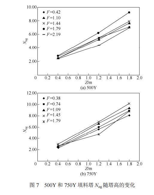 圖7為500Y和750Y填料塔中Nog隨塔高的變化。由圖7(a)可以看出,大多數情況下500Y填料塔中Nog隨塔高的變化為一條直線,即總體積傳質系數沿塔高不發生變化。這是因為在適宜的操作范圍內,塔內流動狀態比較穩定,氣相負荷一定時,氣相傳質系數不變。正庚烷-甲基環己烷為純有機物系,表面張力中性體系,塔內形成的微弱的正表面張力梯度有利于液膜的穩定,從而使有效傳質面積保持恒定。由此可以推測,對有機負體系而言,負的表面張力梯度會引起液膜沿流動方向不斷破碎,造成有效傳質面積的減小,因此Kya隨塔高下降不斷降低。這與耿皎等[18]在直徑為30mm的玻璃精餾塔中選用正體系庚烷-甲苯和負體系苯-庚烷的精餾實驗得到的結論一致。從圖7(a)可得當氣相負荷過小或過大時,500Y填料塔中Nog隨塔高的變化并不是一條直線,這說明總體積傳質系數Kya沿塔高發生變化。當氣相負荷很小時,總體積傳質系數Kya沿氣相流動方向減??;當氣相負荷很大時,總體積傳質系數Kya沿液相流動方向減小。當流體流量過高或過低時,塔內流動狀態極不穩定,過低的氣相負荷,使氣相傳質系數沿氣相流動方向減小、氣液相接觸減弱,即表現為總體積傳質系數Kya隨塔高增加而減小;而過大的氣相負荷,引起液泛,液體積聚在塔上部很難流下,使沿液相流動方向液相傳質系數減小、氣液相接觸減弱,即表現為總體積傳質系數Kya隨塔高降低而減小。對比圖7(a)和7(b)可得,750Y填料塔中總體積傳質系數Kya隨塔高的變化規律與500Y填料塔一致。